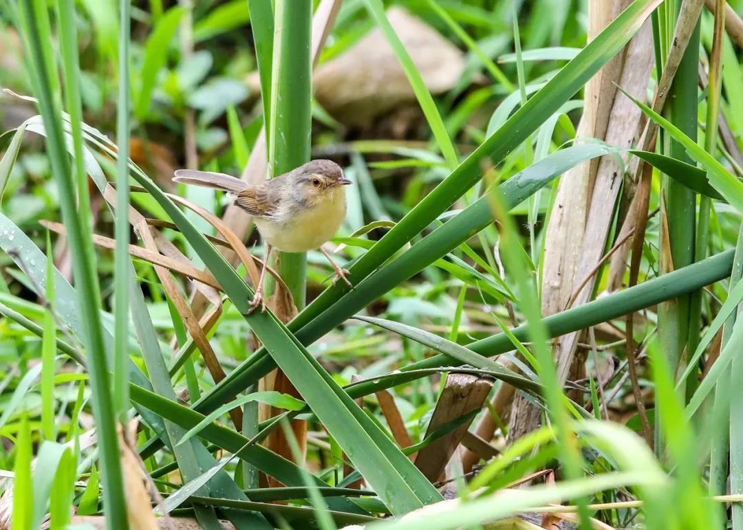 這只落腳于高大水草之中的純色山鷦(jiao)鶯是一種體型略大而尾長的鳥類,它的眉紋色淺,上體暗灰褐,下體淡皮黃色至偏紅。