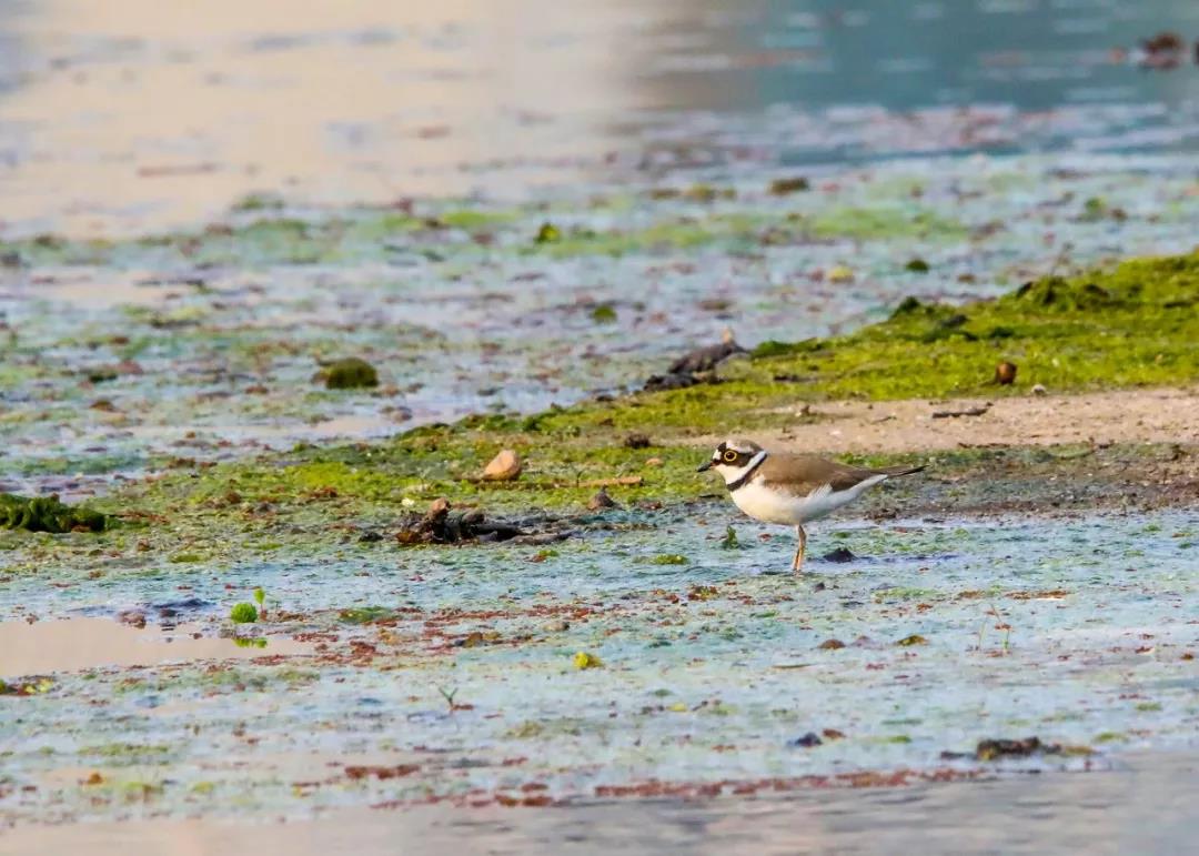 這只小喬可愛的鳥類屬于小型鸻科鳥,它的眼瞼四周是金黃色,有明顯的白色領(lǐng)圈,其下有明顯的黑色領(lǐng)圈。