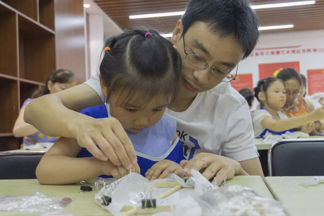 坐在王子涵旁邊的是一對父女,女兒叫姚古依,在爸爸的幫助下,完成了一幅蝴蝶流蘇團扇。“在家里,經(jīng)常是我陪她一同完成她的衣柜、書架的安裝,駕輕就熟。” 姚古依的爸爸說,一同完成一件手工作品,可以加深親子之間的交流,也是情感溝通的一種方式。