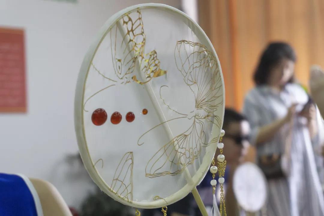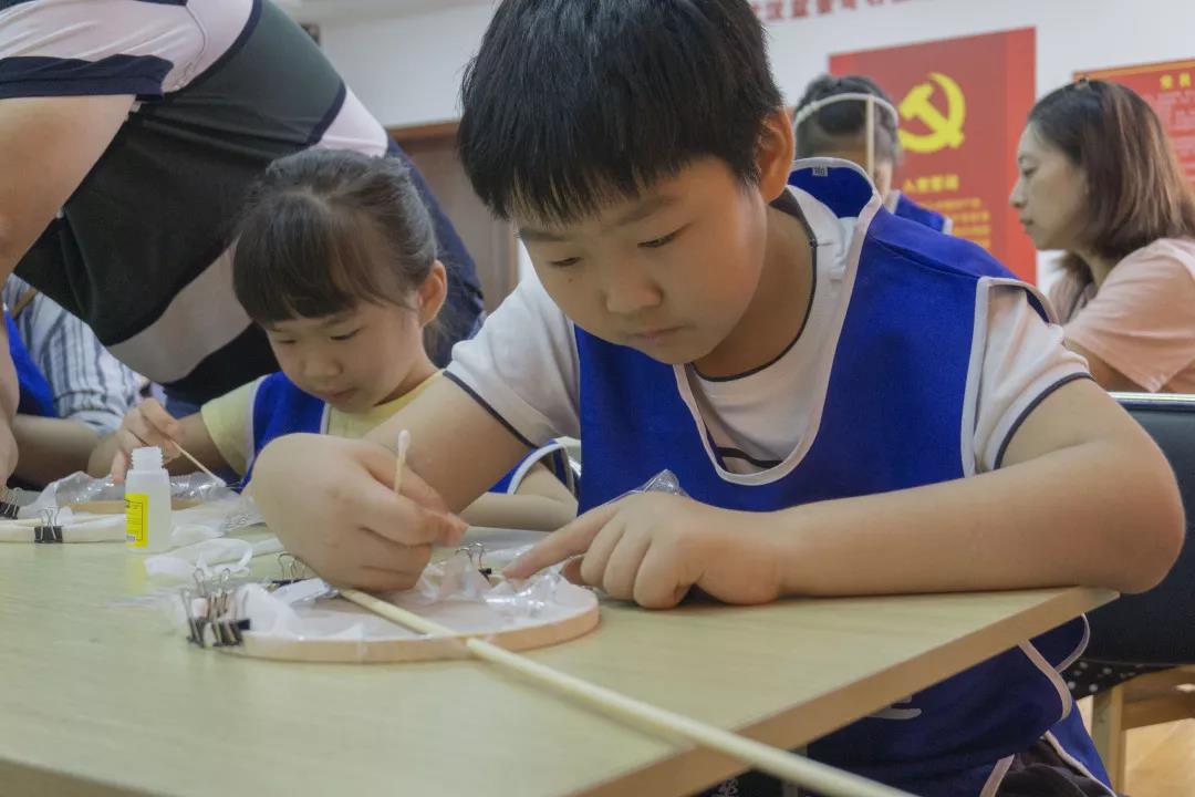 “美學價值極高的瑪瑙,也可以妝點日常生活小物件。“程老師鼓勵孩子們發(fā)揮自己的創(chuàng)造力和動手能力,將風雅的團扇和華麗的瑪瑙相結(jié)合,親身示范做個瑪瑙團扇。”首先用帶花紋的紗布貼在團扇骨架上作為扇面,再把流蘇等飾品貼在扇子邊緣,提升它的顏值;最后用膠水把若干粒紅色小瑪瑙貼在扇面上,和扇面圖案相結(jié)合。”看似簡單的步驟,實際操作起來,考驗孩子們的耐心和審美。