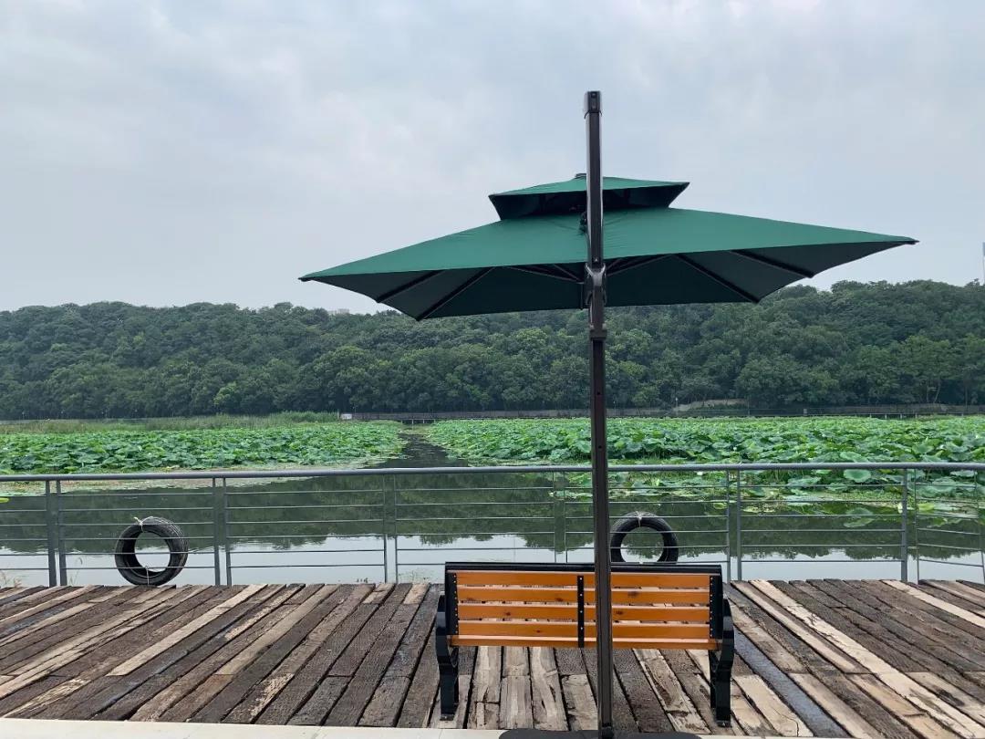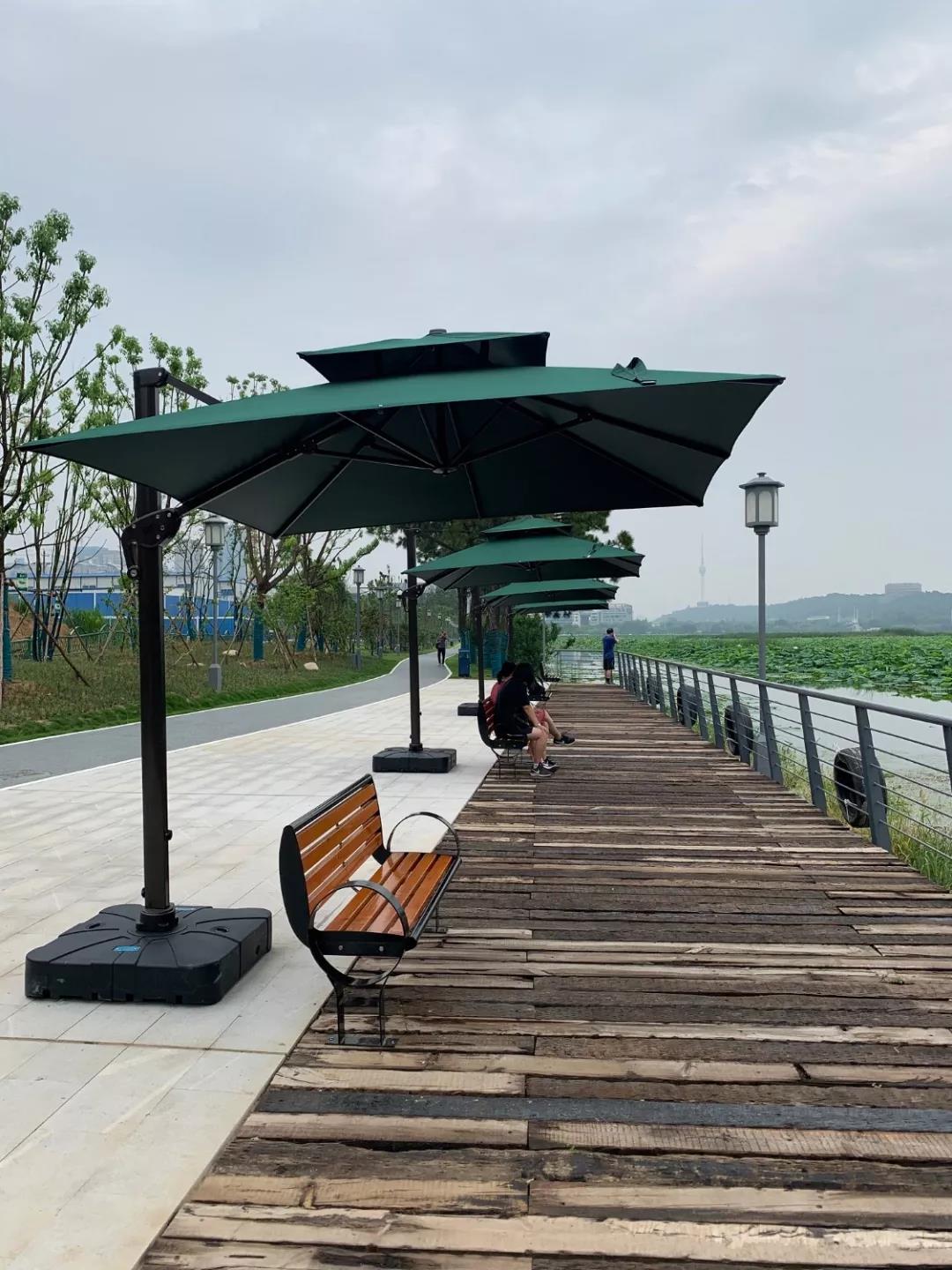 景區(qū)基建科工作人員潘毅持介紹,綠道“濱水郊野段”位于月湖北岸,陽光較充足,因此盛夏時(shí)節(jié),這里十分炎熱。在接到市民建議后,基建科迅速組織人員開展測量座椅尺寸、設(shè)計(jì)遮陽方案等工作,“我們在參考了漢口江灘公園座椅遮陽傘的樣式后,又在數(shù)十種不同材質(zhì)的傘中挑選出這類近2000元一組的防風(fēng)遮陽傘,此類傘能有效的防止風(fēng)吹日曬”。