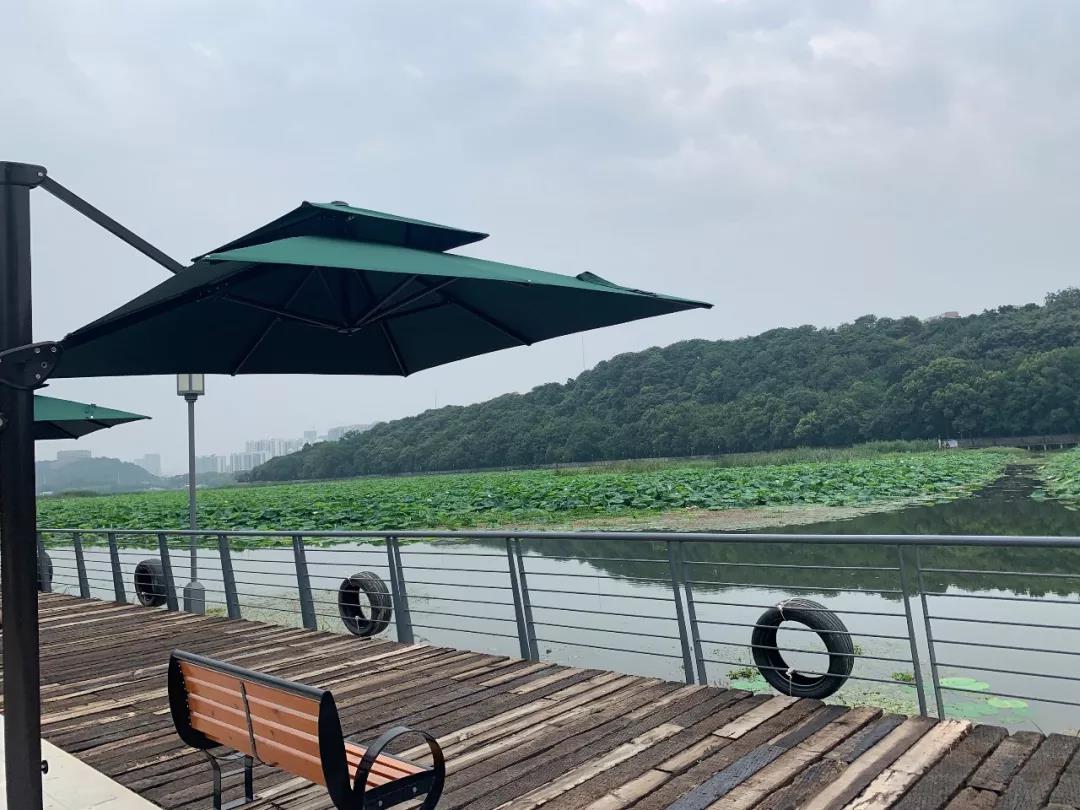 7月4日,月湖綠道“濱水郊野段”觀景平臺(tái)有不少市民在休閑座椅處休息。4個(gè)休閑座椅被4把草綠色的遮陽傘所遮蓋,約2.5米高的傘架能遮蓋約5平方米的區(qū)域面積,座椅正對面即是月湖水面繁茂的亭亭荷花。