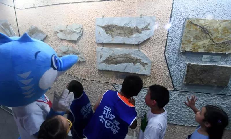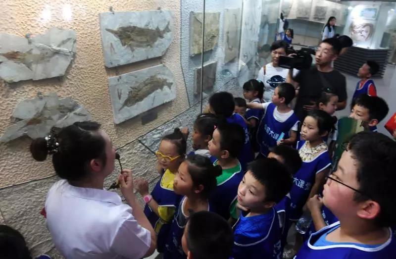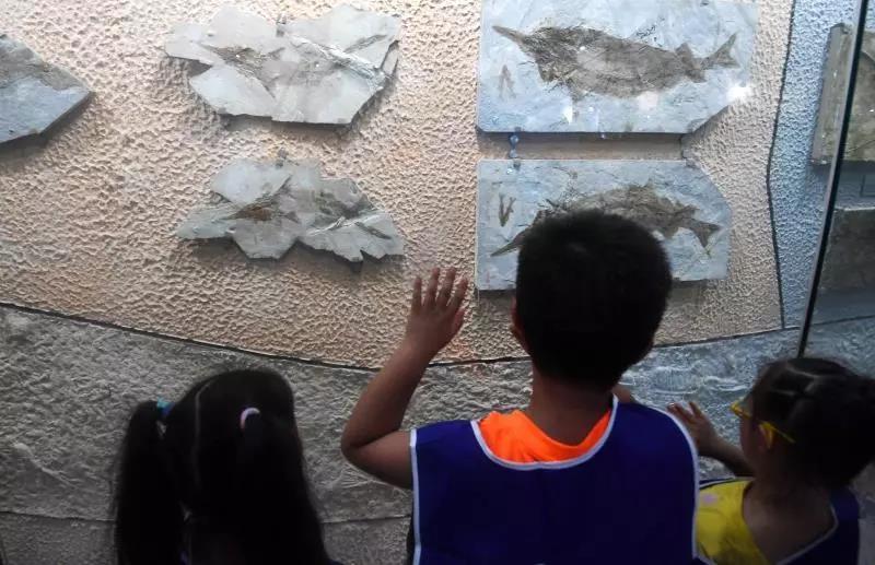(小學(xué)生們觀察中華鱘化石)