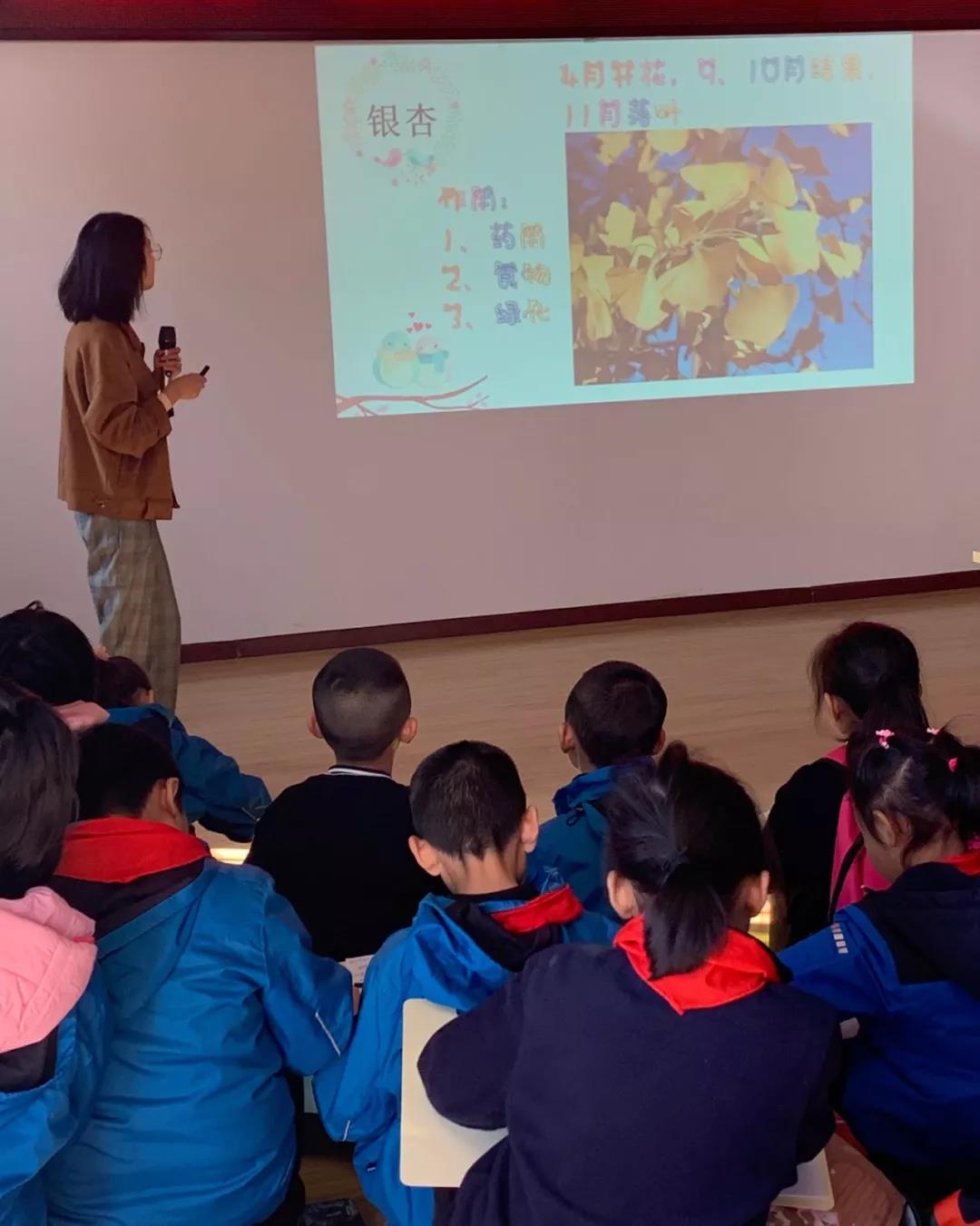 當(dāng)天上午,來自湖北大學(xué)地理教育學(xué)的研究生肖梓蝶作為植物導(dǎo)師給小學(xué)生進(jìn)行了科普,“秋冬季節(jié)溫度較低,植物體內(nèi)的花青素含量增多,花青素遇酸性物質(zhì)發(fā)生反應(yīng),使植物葉片呈現(xiàn)黃、紅等顏色。”
