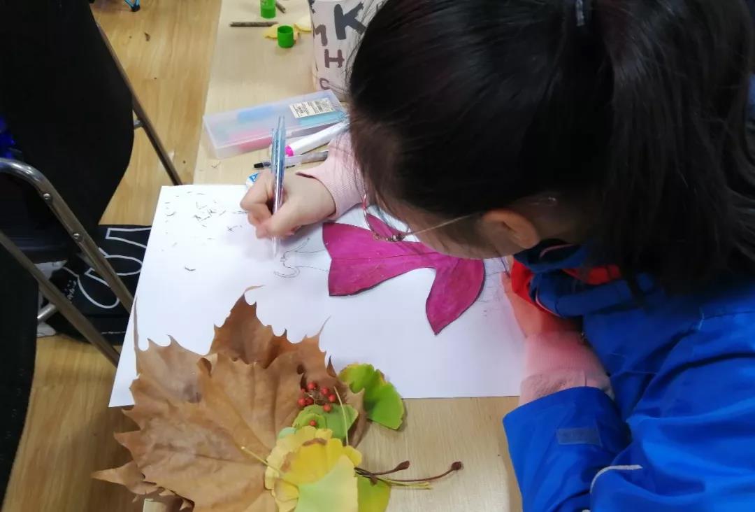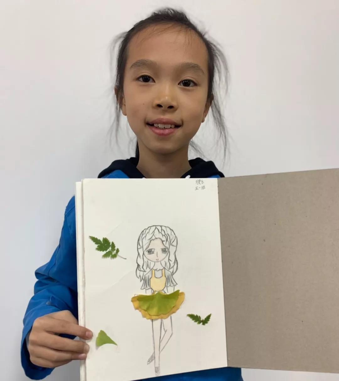 穿著銀杏裙的小女孩仿佛要翩然起舞、兩片烏桕樹葉拼接而成的“美人魚”栩栩如生、一只悠閑的天鵝在水中遨游,而它的身體就是玉蘭的葉子模樣......在學(xué)生們的精心繪制下,一個(gè)個(gè)生動(dòng)的形象躍然紙上。