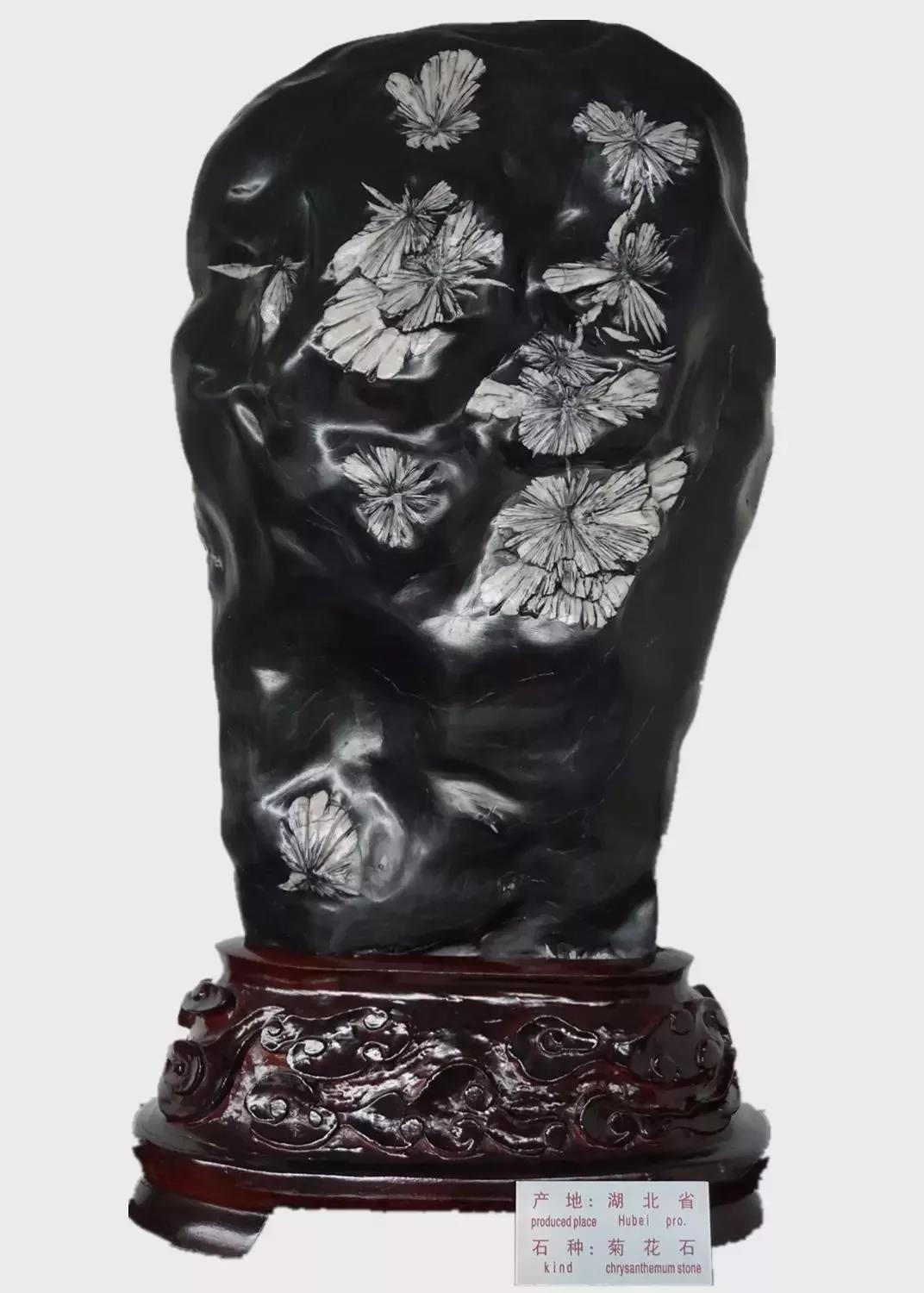 菊花石的質(zhì)地堅硬,外表呈青灰色,里面有天然形成的白色菊花形礦物結(jié)晶體。其中,“花蕊”部分是晶粒狀礦物的集合體,“花瓣”由一個個礦物晶體斷續(xù)連接所形成,其長短不等,以“花蕊”為中心向四周呈放射狀排列,形態(tài)萬千,蔚為奇觀。