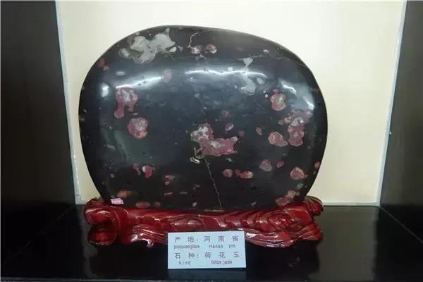 荷花玉產(chǎn)于河南汝河流域,由于該石種在深幽的墨綠色的石底上呈現(xiàn)出翠綠色的荷葉狀斑紋和“清水出芙蓉,天然去雕飾”的粉紅色荷花畫面而得名“荷花玉”,其顏色特別古典,雅致,賞其石,給人一種特別寧靜的自然之美。