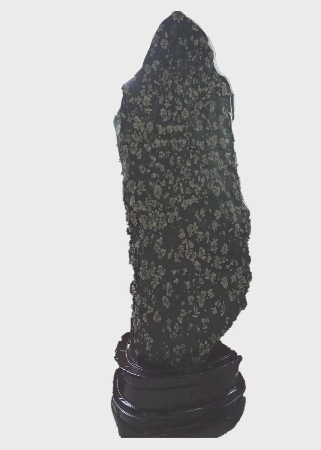 牡丹石的底色為黑色,石體上均勻分布了很多的或白或綠的晶狀體,宛如一朵朵國色天香的牡丹,由此得名“牡丹石”。